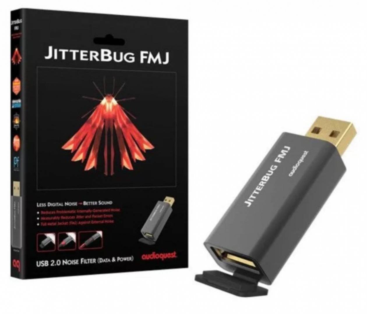 Lọc nhiễu USB AudioQuest JtterBug FMJ ra mắt là một phiên bản nâng cấp của AudioQuest JitterBug, đây là một phụ kiện USB nhỏ gọn lọc nhiễu độc lạ mà AudioQuest nghiên cứu cùng những tính năng mới hấp dẫn.  Thiết kế của mẫu lọc nhiễu này được nâng cấp với lớp vỏ kim loại cao cấp hơn, giúp bảo vệ thiết bị hiệu quả tránh tác động xấu đến thiết bị.